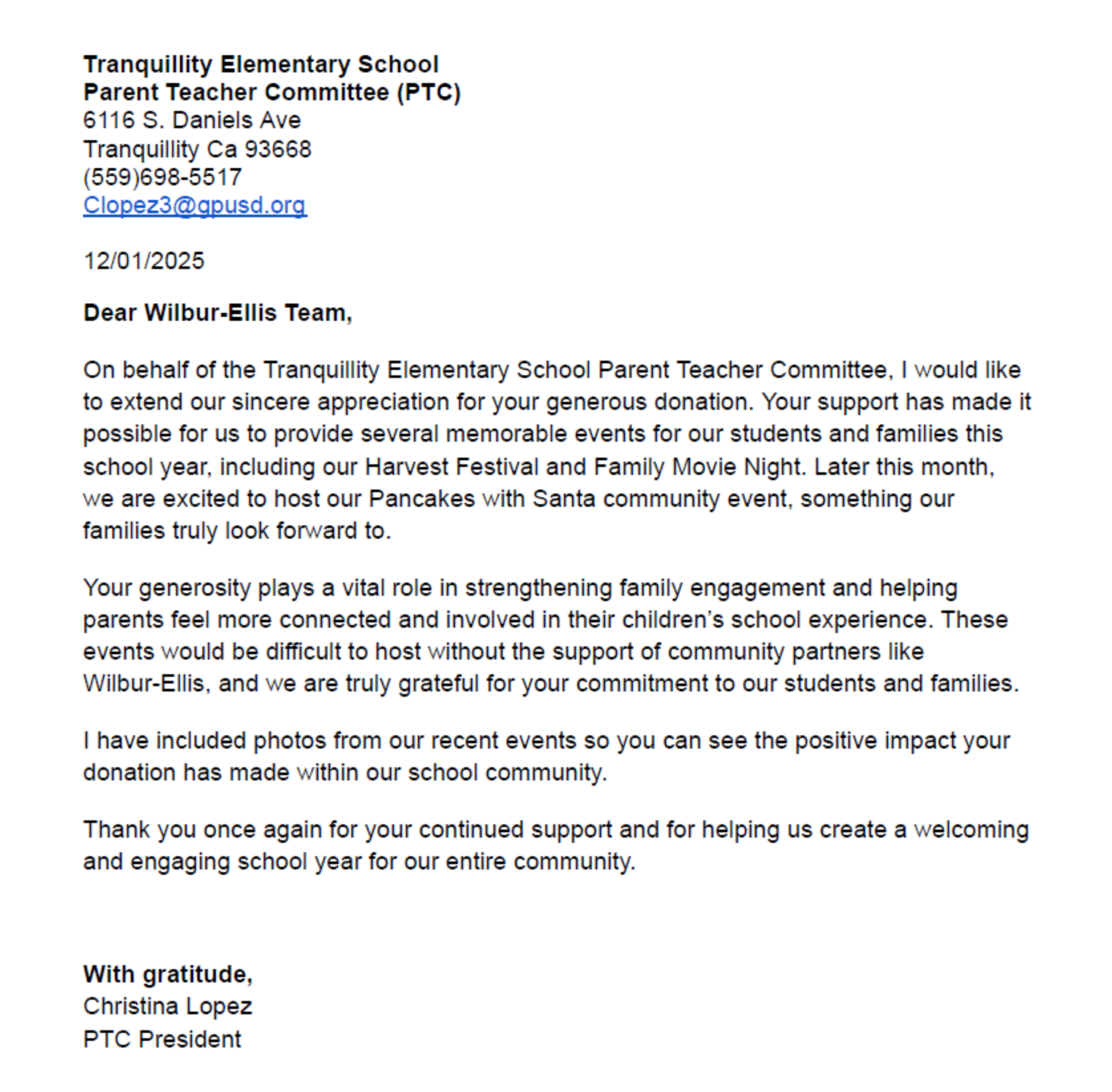 Wilbur-Ellis makes a $1,000 donation to help fund a variety of programs that enrich children’s education and strengthen the school community in Tranquillity, CA.